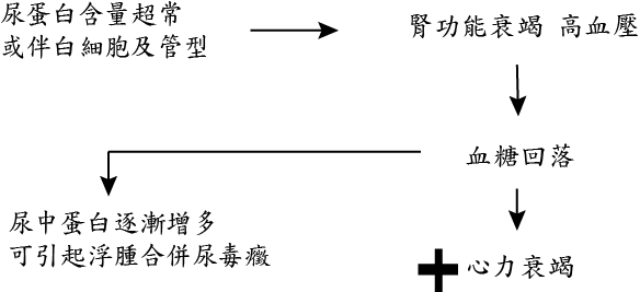糖尿病性肾小球硬化症的特征是肾小球基底膜增厚,渗透性增加。随着时间的推移,肾小球系膜空间变大(用来存储IV型胶原蛋白),初期爲弥漫性,后期爲结节性。糖尿病人的肾小球硬化在糖尿病发生之初就可能存在,只是不显著而被忽视。糖尿病肾病从开始到心力衰竭合并尿毒症大体过程: