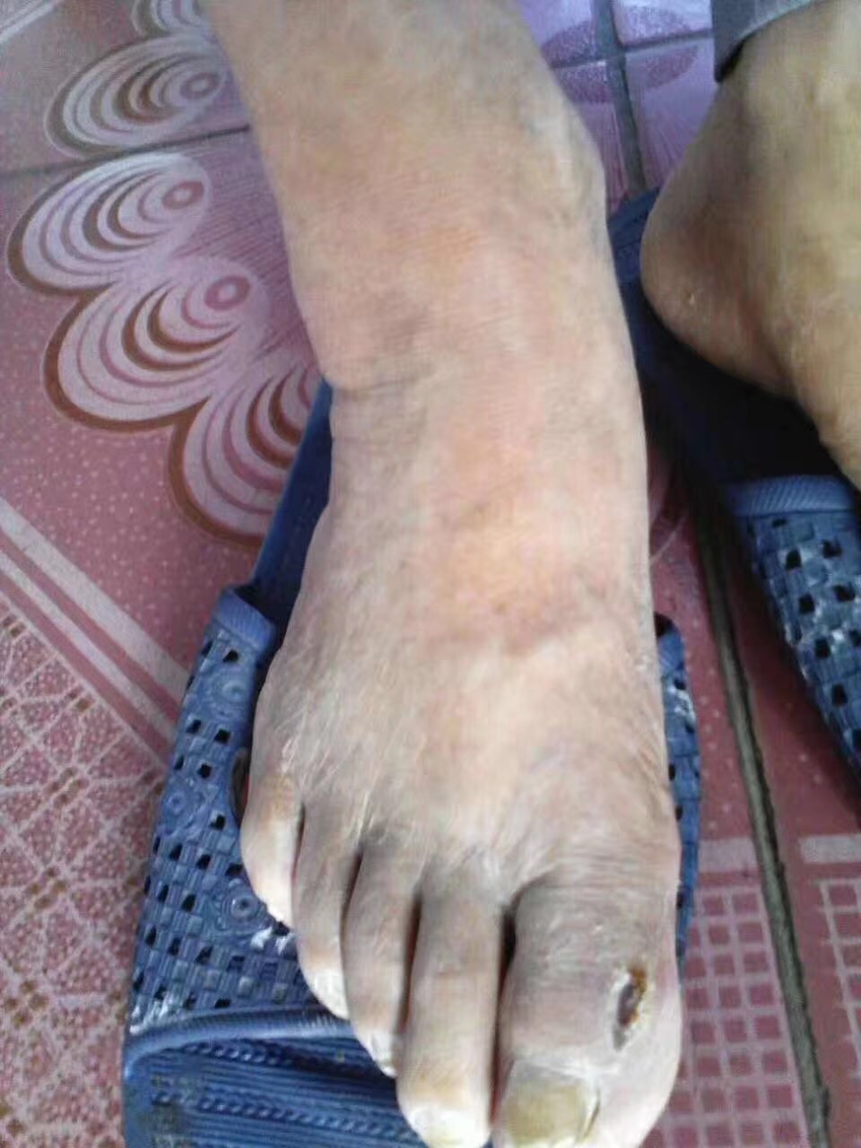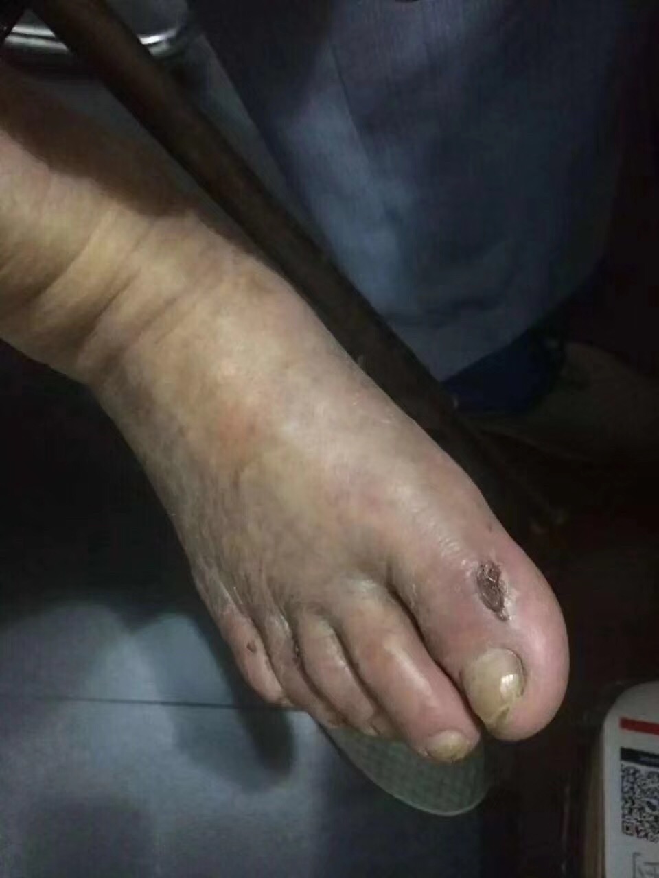 初克武,男,78岁,武钢退休,糖尿病病史14年,每天胰岛素早12,中午12,晚9个,半夜24个,血糖在胰岛素控制下空腹7、8,餐后12、1。但从前5年开始眼睛模糊,身上瘙痒,腿脚肿胀,大脚趾开始溃烂,医院告知没有任何办法。服用桑黄子三月后腿脚消肿,大拇指开始结痂。