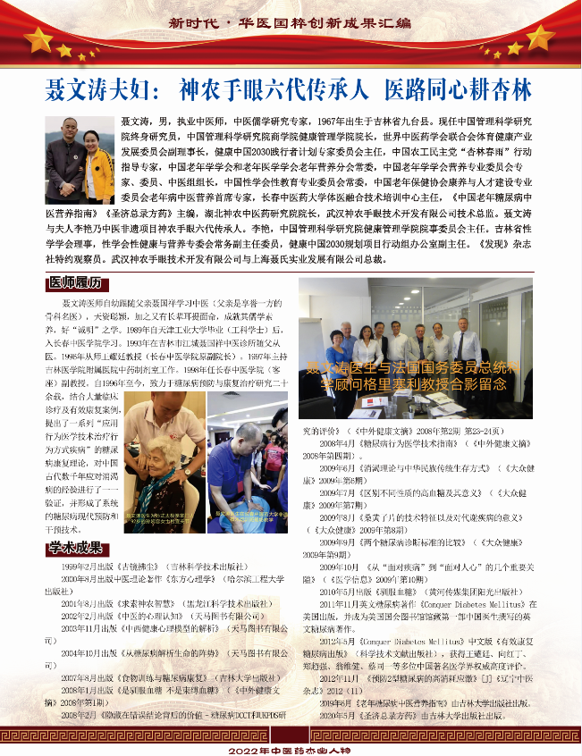 聂文涛医生传承的神农手眼中医非遗技术成果被入选到《2022年中医药杰出人物-新时代·华医国粹创新成果汇编》,此汇编出版是面向全国发行的,此次汇编是由中国医药教育协会的黄正明黄会长亲自主编的,由中国医药教育协会药促工委主办,中国医药教育协会药促工委的官方网站也做了非遗技术神农手眼技术成果的报道。中国医药教育协会是隶属于国务院国资委主管的行政事业单位,是国内唯一的一个主管着中医药教育的。